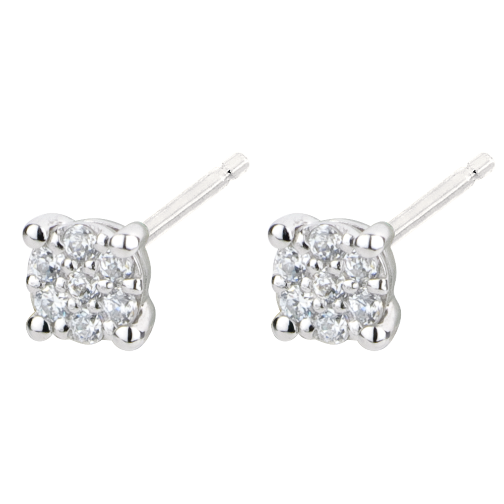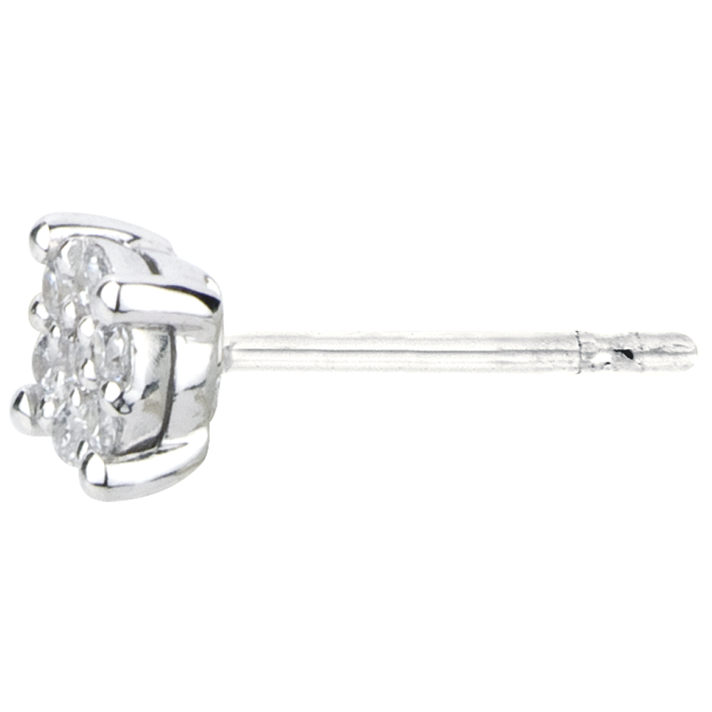 Une myriade de diamants tels des étoiles en rendez-vous forme un solitaire audacieux qui se décline sur chaque boucle d'oreilles. 14 diamants : 0.07 carat - Or blanc (9 carats = 375/1000): 0.5 g. Cluster de diamants naturels : 14 - Total: 0.07 caratPlus dimensions
