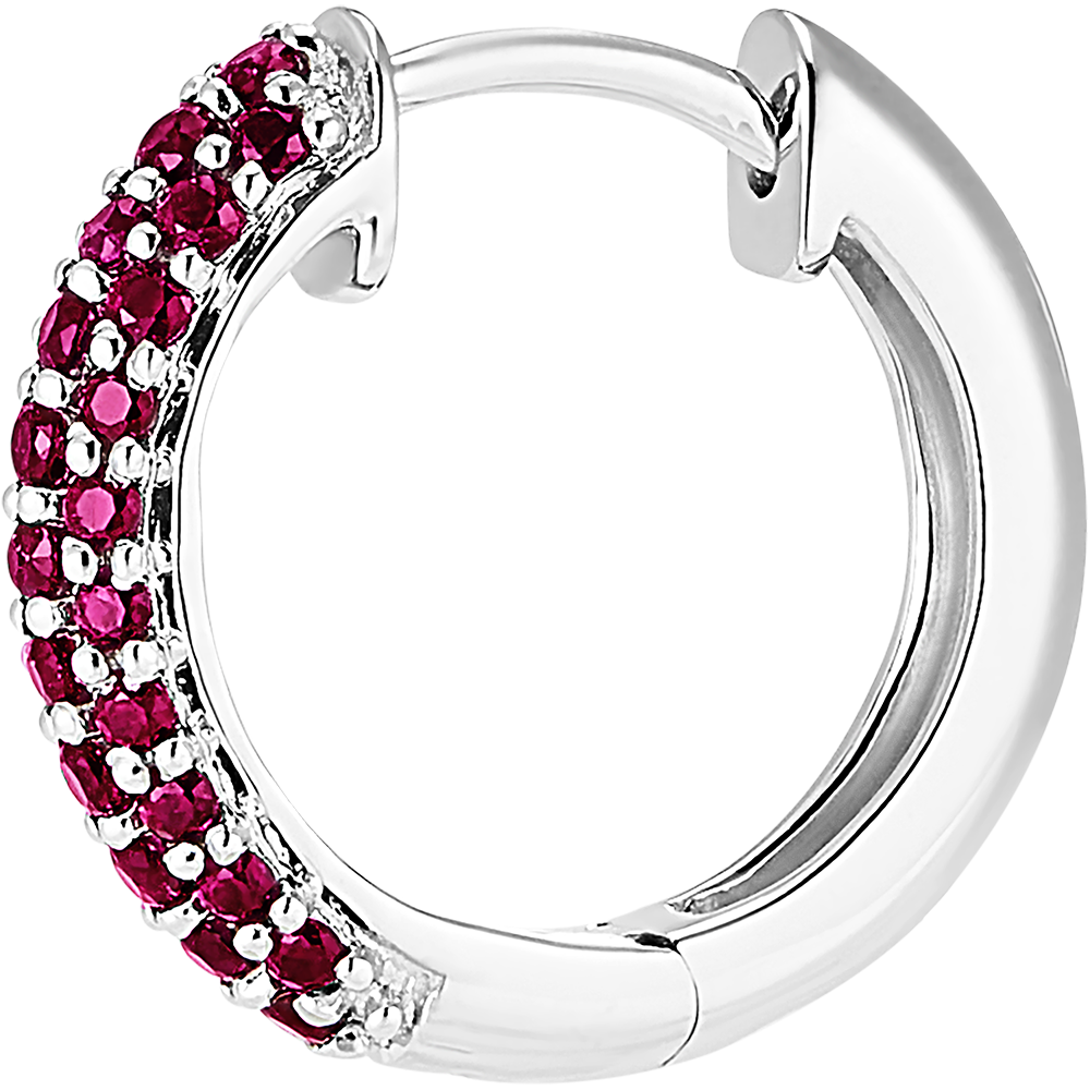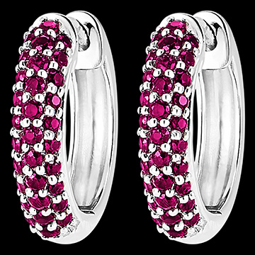 Une paire de créoles or blanc sertie de 62 rubis délicats sur trois rangs. Un bijou classique et intemporel à la fois pour une note colorée. Or blanc (9 carats = 375/1000): 2 g. Rubis : 62 - Total: 0.5 carat Plus dimensions