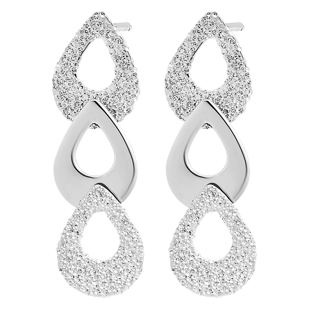 Une paire de boucles d'oreilles puces or blanc résolument modernes. Parées d'un motif de 3 poires assemblées les unes aux autres, deux poires sont en or texturisé - effet diamanté - et une est polie. Coup de cœur assuré.