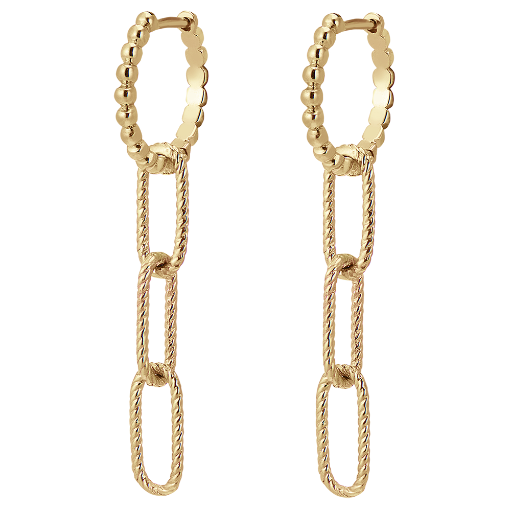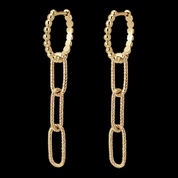 Un trio de maillons or jaune finement torsadés se balancent sur un anneau d'or perlé . Une paire de boucles d'oreilles pendantes modernes et un peu rock.