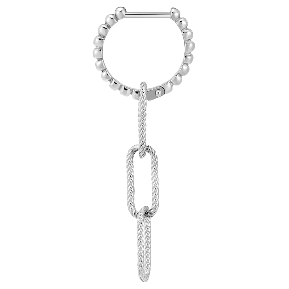 Un trio de maillons or blanc finement torsadés se balancent sur un anneau d'or perlé . Une paire de boucles d'oreilles pendantes modernes et un peu rock.