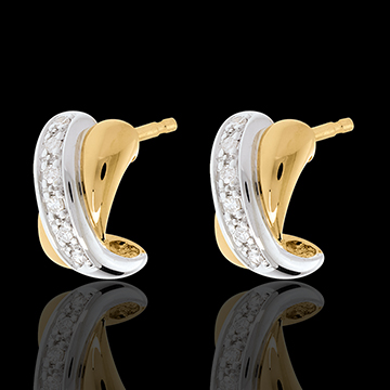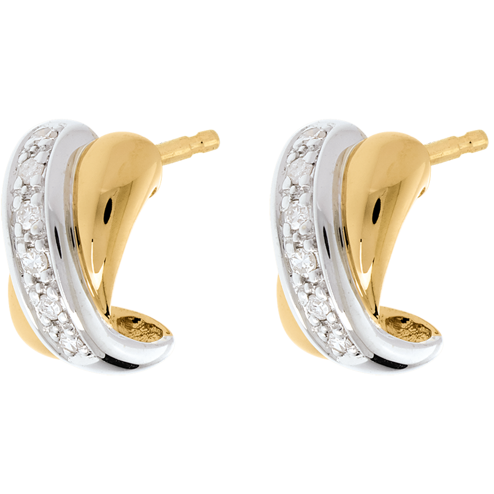 Un tandem demi-lunes or jaune et or blanc pavé diamants pour une paire ronde et raffinée.