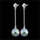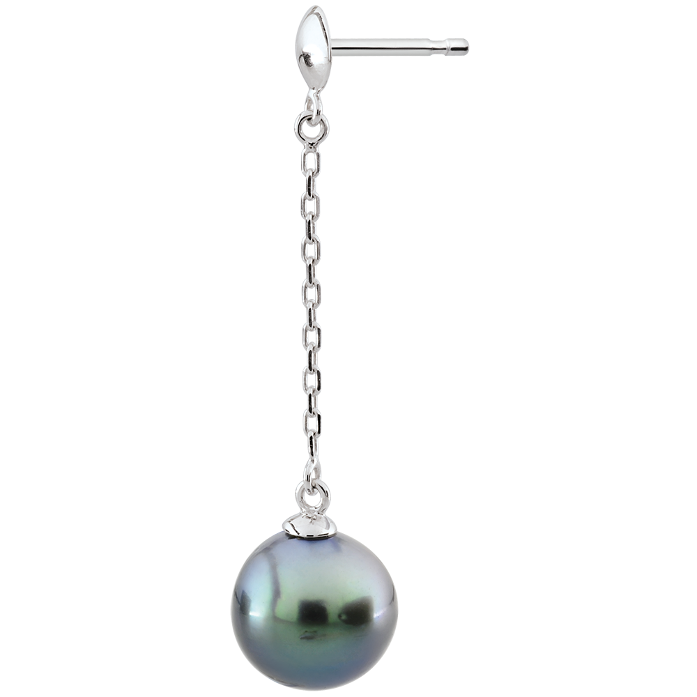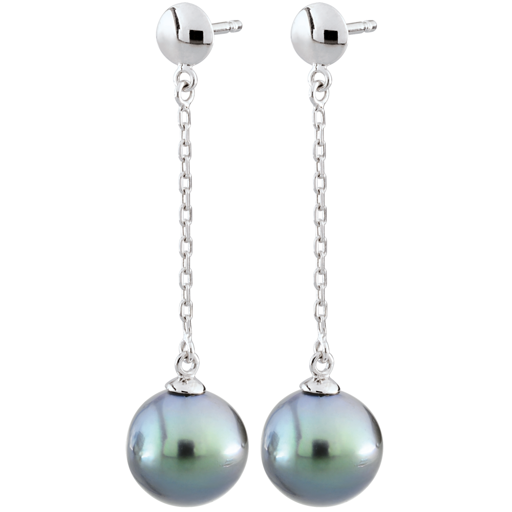 Deux sublimes perles grises de forme ronde sont respectivement suspendues à une fine chaine en or blanc pour des boucles d'oreilles pendantes féminines et raffinées.
