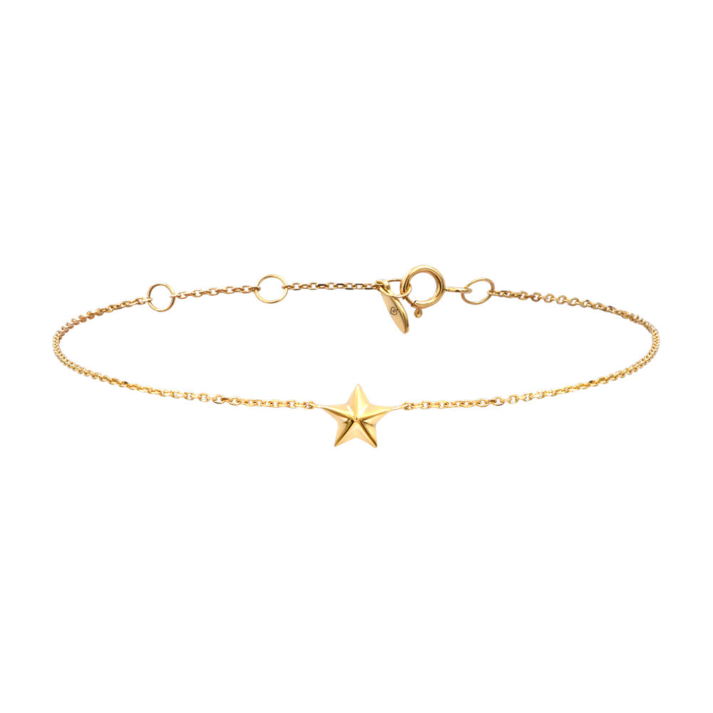Ce bracelet fin en or jaune 9 carats présente une étoile stylisée suspendue délicatement à une chaîne légère.