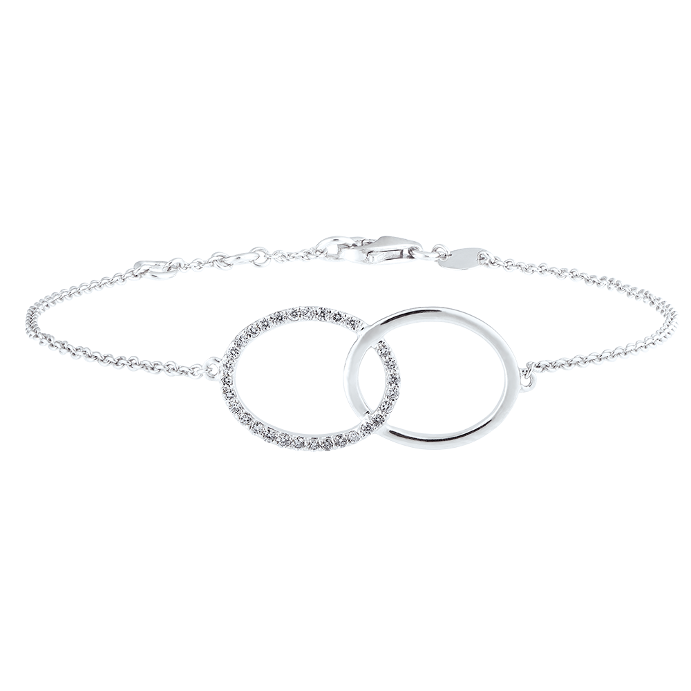 Tels des rubans, les cercles d'or blanc sont enchevêtrés tout en souplesse. Un cercle tout or et un cercle or et diamants.
