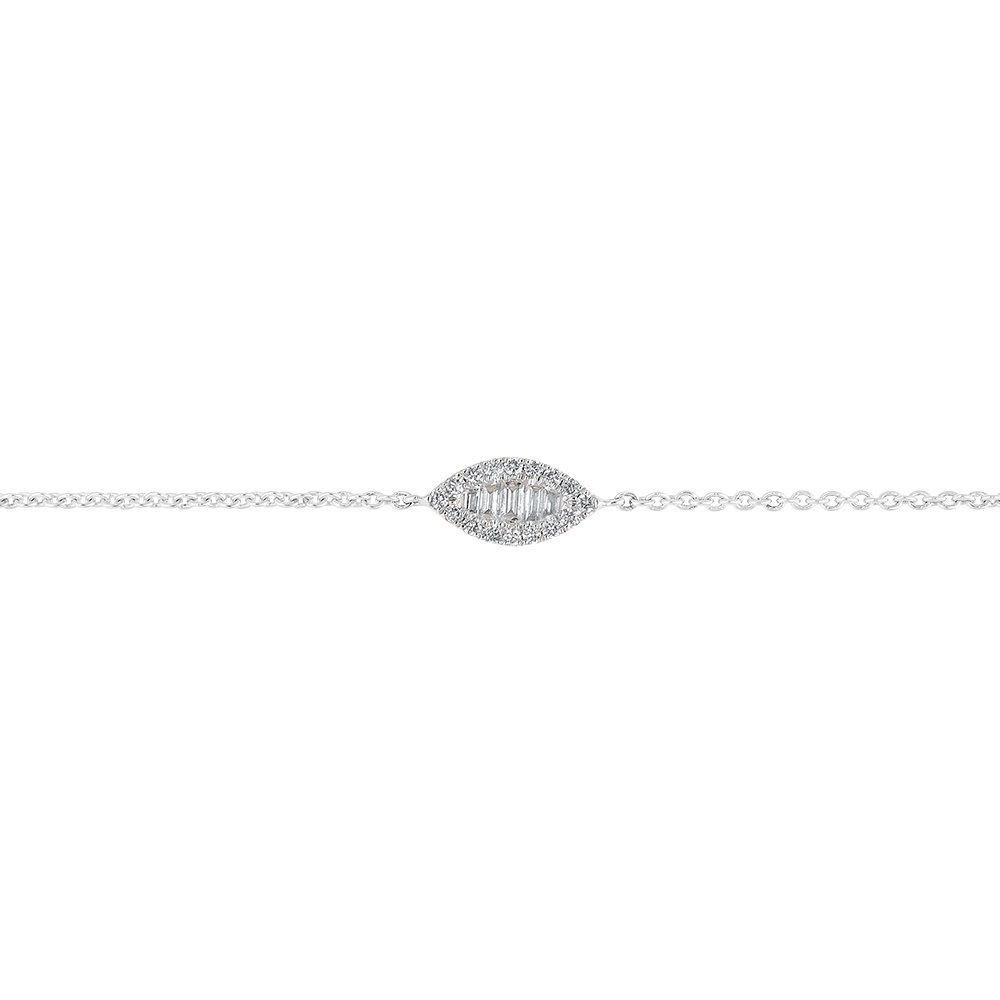 Un bracelet fin et féminin aux formes inspirées des contes d'Orient. Le motif de cinq diamants baguette est délicatement souligné d'un pavage diamant en amande et monté sur chaînette or blanc. Bracelet de longueur réglable : 18cm, 17cm, 16cm. 21 diamants : 0.21 carat - Or blanc (9 carats = 375/1000): 1.4 g.Plus dimensions