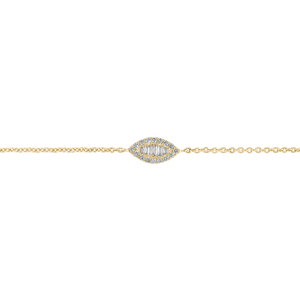 Un bracelet fin et féminin aux formes inspirées des contes d'Orient. Le motif de cinq diamants baguette est délicatement souligné d'un pavage diamant en amande et monté sur chaînette or jaune. Bracelet de longueur réglable : 18cm, 17cm, 16cm.