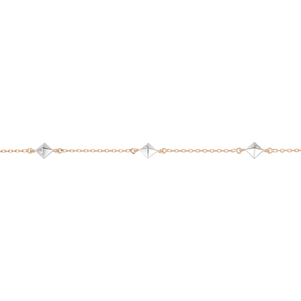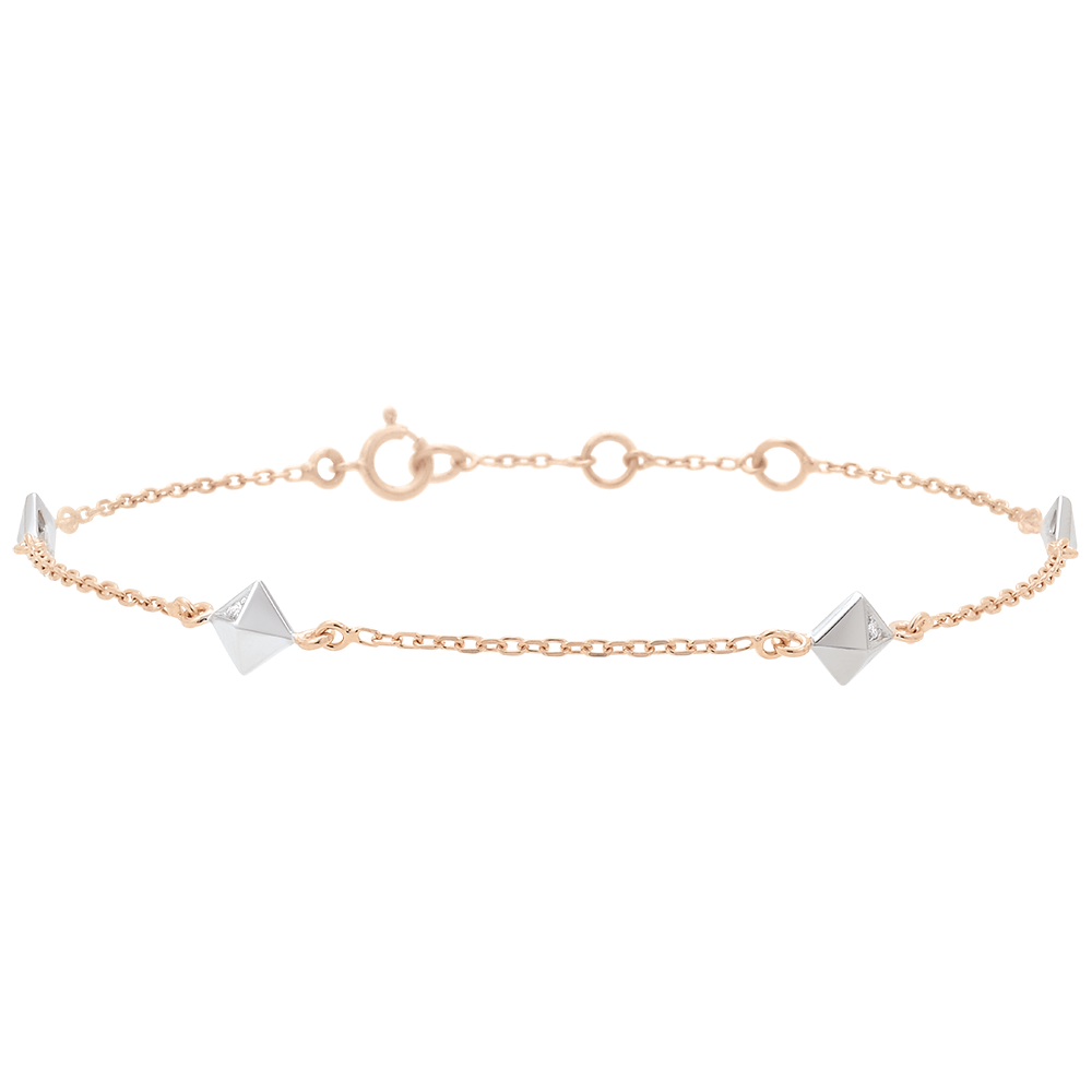 Inspiré par la forme d'un diamant brut, ce bracelet présente des pyramides précieuses dont une facette est sertie d'un diamant. Ce design moderne et élégant sublime la finesse du bijou. Le bracelet en or blanc et or rose 9 carats est réglable en longueur (16, 17 ou 18 cm) pour un confort optimal au poignet. Le motif mesure 5 mm de longueur et 5 mm de hauteur, offrant un équilibre parfait entre discrétion et présence.… Voir plus Infos techniques