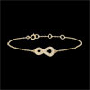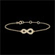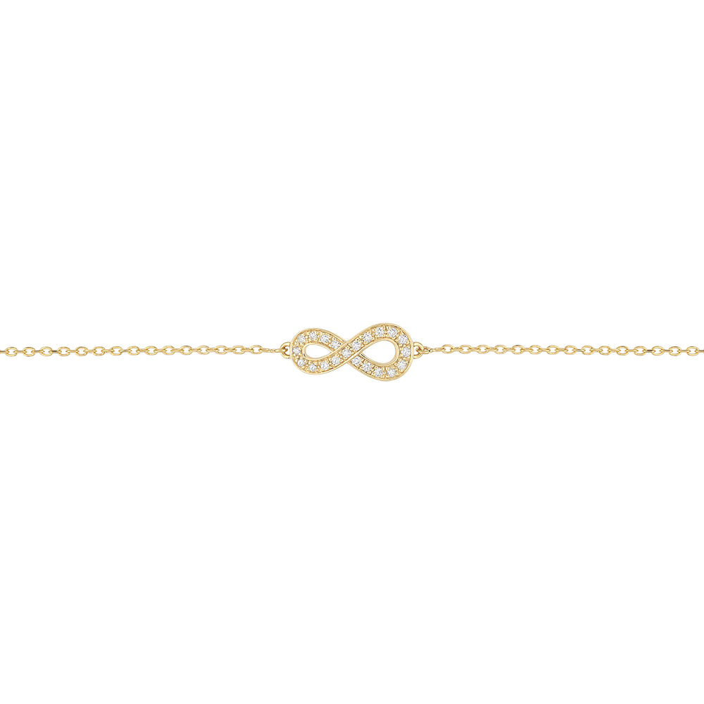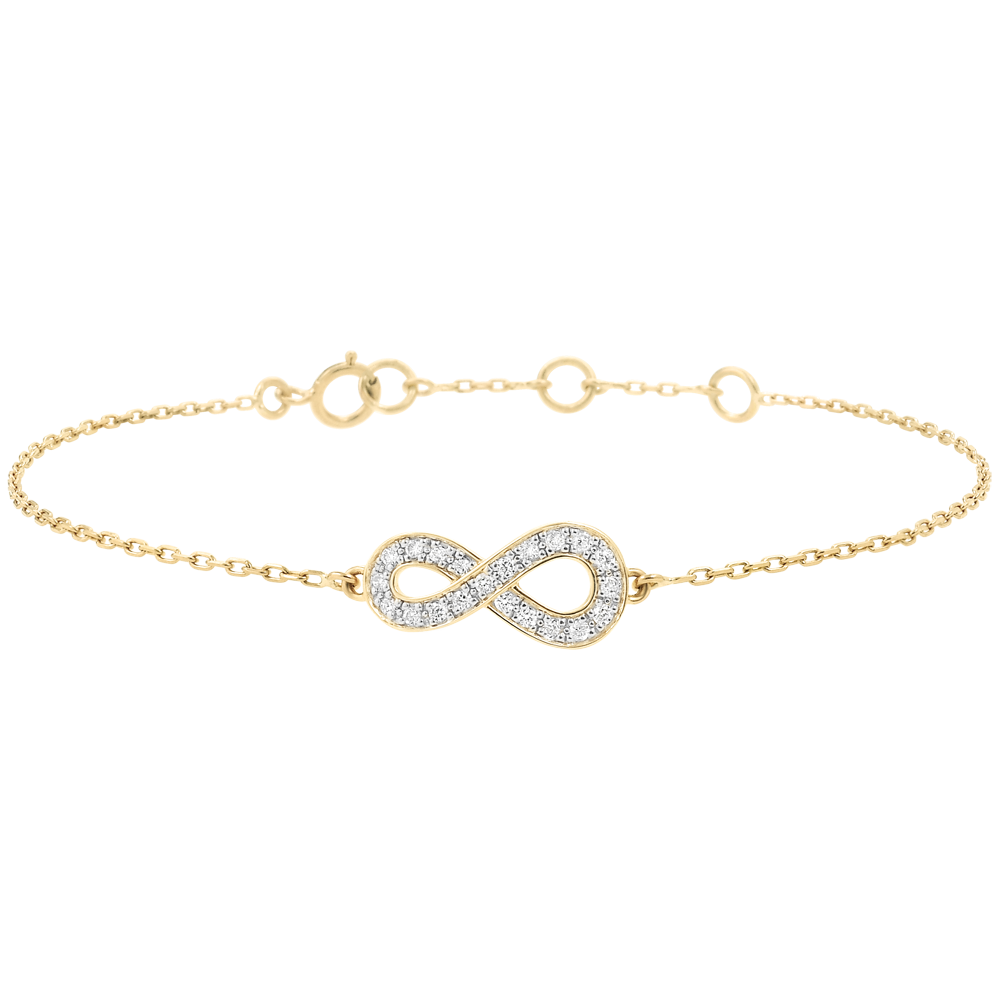 Un signe infini en or jaune serti de diamants est monté en bracelet. Il est le symbole d'éternité absolu. Bracelet de longueur réglable: 18cm, 17cm, 16cm. Motif de 15mm de longueur et 7mm de hauteur. 21 diamants : 0.11 carat - Or jaune (9 carats = 375/1000): 0.9 g. Plus dimensions