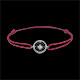Un cercle de perles d'or entoure un cercle de diamants et un solitaire en son centre. Le motif est monté sur un cordon rouge moderne. Bracelet de longueur réglable: 18cm, 17cm, 16cm. Motif de 11mm longueur et 11mm de hauteur. 1 diamant : 0.01 carat - Or blanc (9 carats = 375/1000): 0.8 g. Diamant : 1 - Diamant noir : 4 - Total: 0.016 carat Plus dimensions