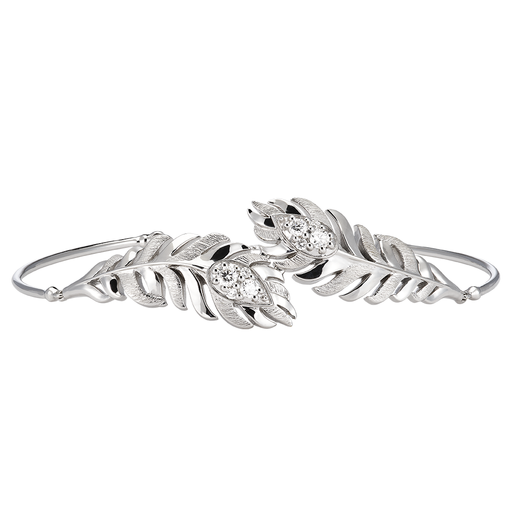 Le bracelet Signature en or blanc 9 carats arbore un élégant motif de plume, orné de 8 diamants synthétiques. Finement élaboré, son design enchâssé se clos par un fermoir discret. Une pièce qui capture l'essence aérienne et le raffinement inégalé des plumes, signature de la collection Panache.