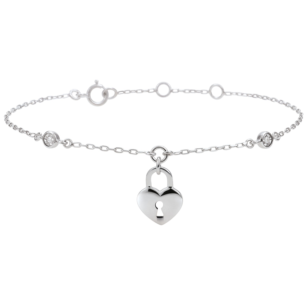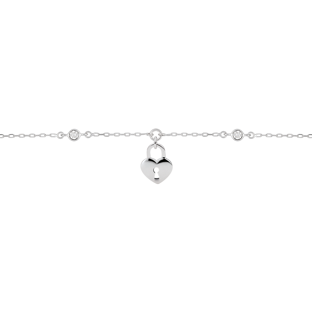 Un coeur en or blanc porteur d'une serrure est monté sur une chaînette en or blanc habillée de deux brillants. Bracelet de longueur réglable: 18cm, 17cm, 16cm. Motif de 8mm de longueur et 11mm de hauteur. 2 diamants : 0.01 carat - Or blanc (9 carats = 375/1000): 1.3 g. Plus dimensions