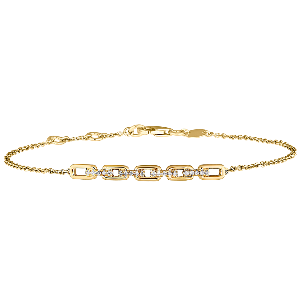 Cinq généreux maillons cubains sertis de diamants contrastent avec une délicate chaînette pour un bracelet or jaune classique revisité. Bracelet de longueur réglable : 18cm, 17cm, 16cm. 20 diamants : 0.08 carat - Or jaune (18 carats = 750/-): 2.6 g. Plus dimensions
