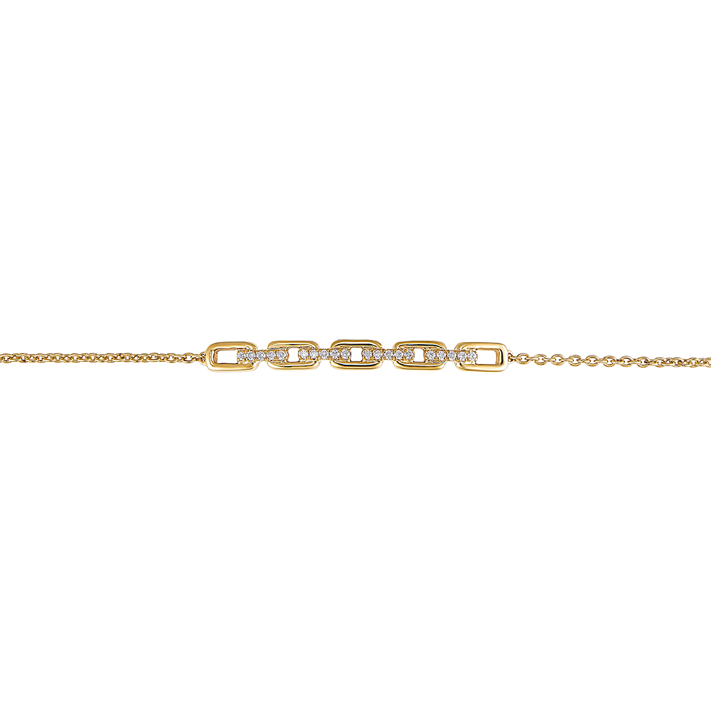 Cinq généreux maillons cubains sertis de diamants contrastent avec une délicate chaînette pour un bracelet or jaune classique revisité. Bracelet de longueur réglable : 18cm, 17cm, 16cm. 20 diamants : 0.08 carat - Or jaune (9 carats = 375/1000): 2 g. Plus dimensions