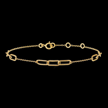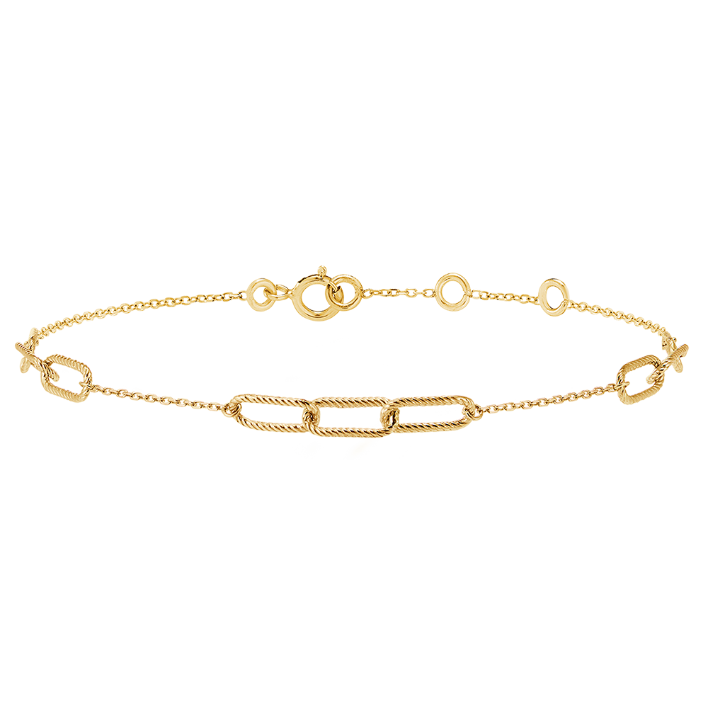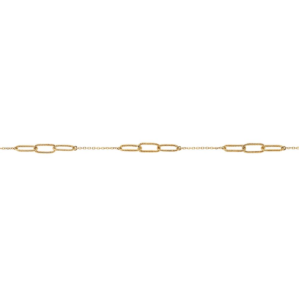 Des trios de maillons or jaune finement torsadés sont liés par une delicate chainette. Un bracelet moderne et un peu rock à la fois. Bracelet de longueur réglable : 18cm, 17cm, 16cm.
