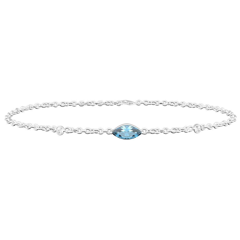 La précieuse pupille symbolisée par une navette de topaze bleue trone au centre de cette fine chaine d'or blanc. Elle est entourée par deux sublimes diamants telles deux larmes figées à jamais. Un bracelet pétillant et précieux à porter avec toutes vos tenues. Dimensions pierre centrale : longueur: 5mm - largeur: 2.4mm. 2 diamants : 0.03 carat. 2 diamants : 0.03 carat - Or blanc (9 carats = 375/1000): 1.3 g. Topaze bleue : 1 - Diamant : 2 - Total: 0.19 carat Plus dimensions