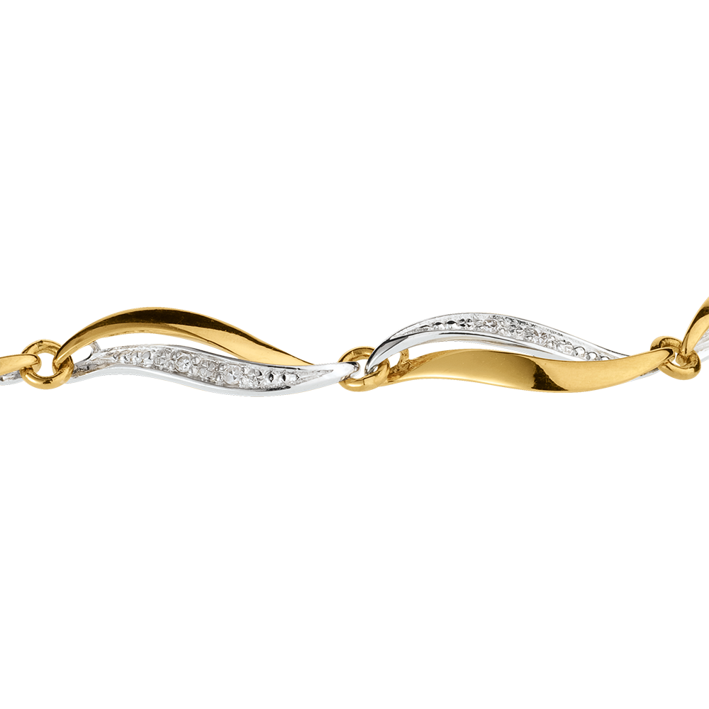 Un bracelet maillons entrelacés, mêlant or jaune et or blanc pavé, pour un mouvement délicat autour du poignet.