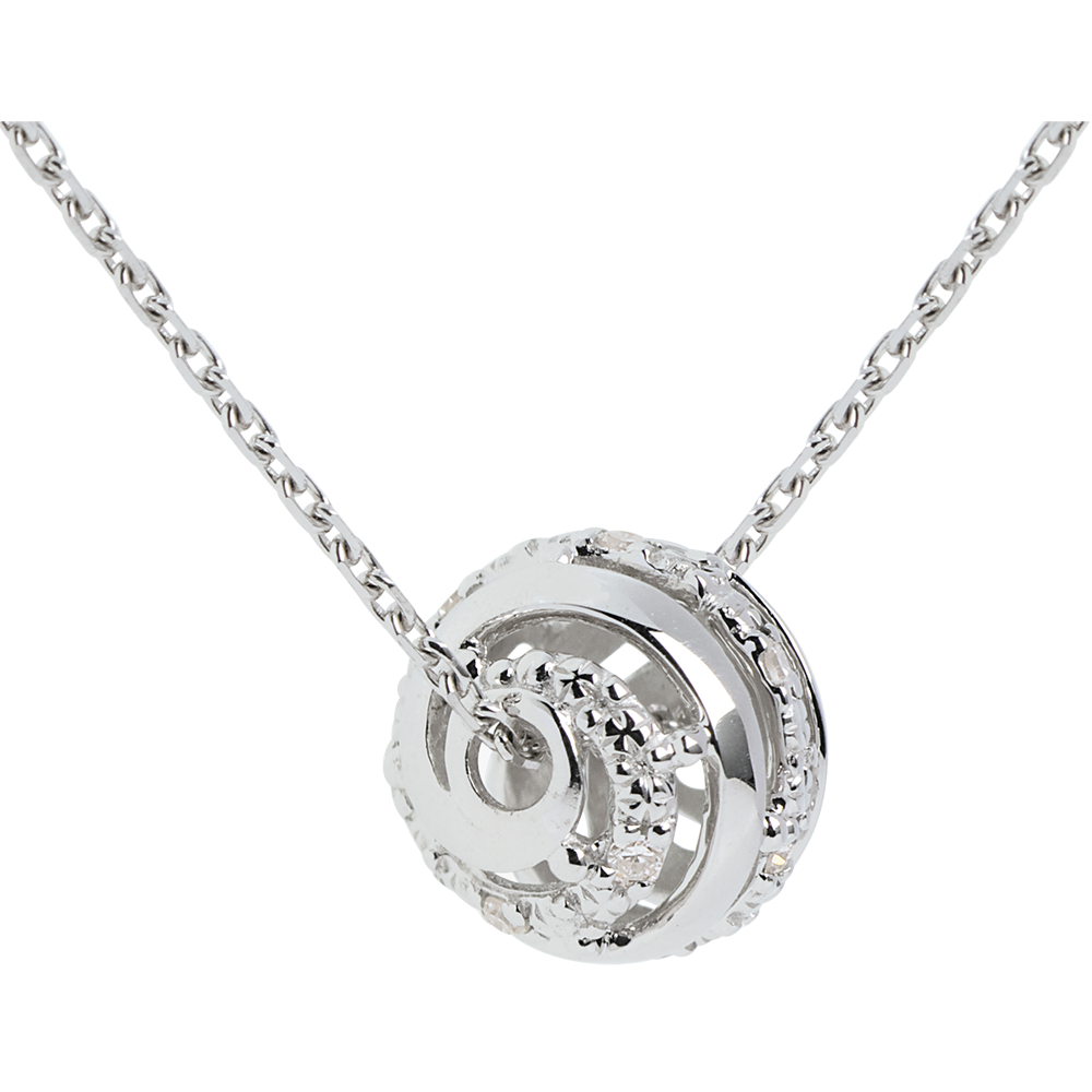 Expression d'un amour intime et protégé pour ce collier chaviré de spirales. Chaîne de 42 cm avec rallonge de 3 cm. Chaine maillon forçat d'épaisseur 0.85mm. Avec chaîne avec double position 42cm et 45cm en or 9 carats. 11 diamants : 0.07 carat - Or blanc (9 carats = 375/1000): 2 g. Plus dimensions