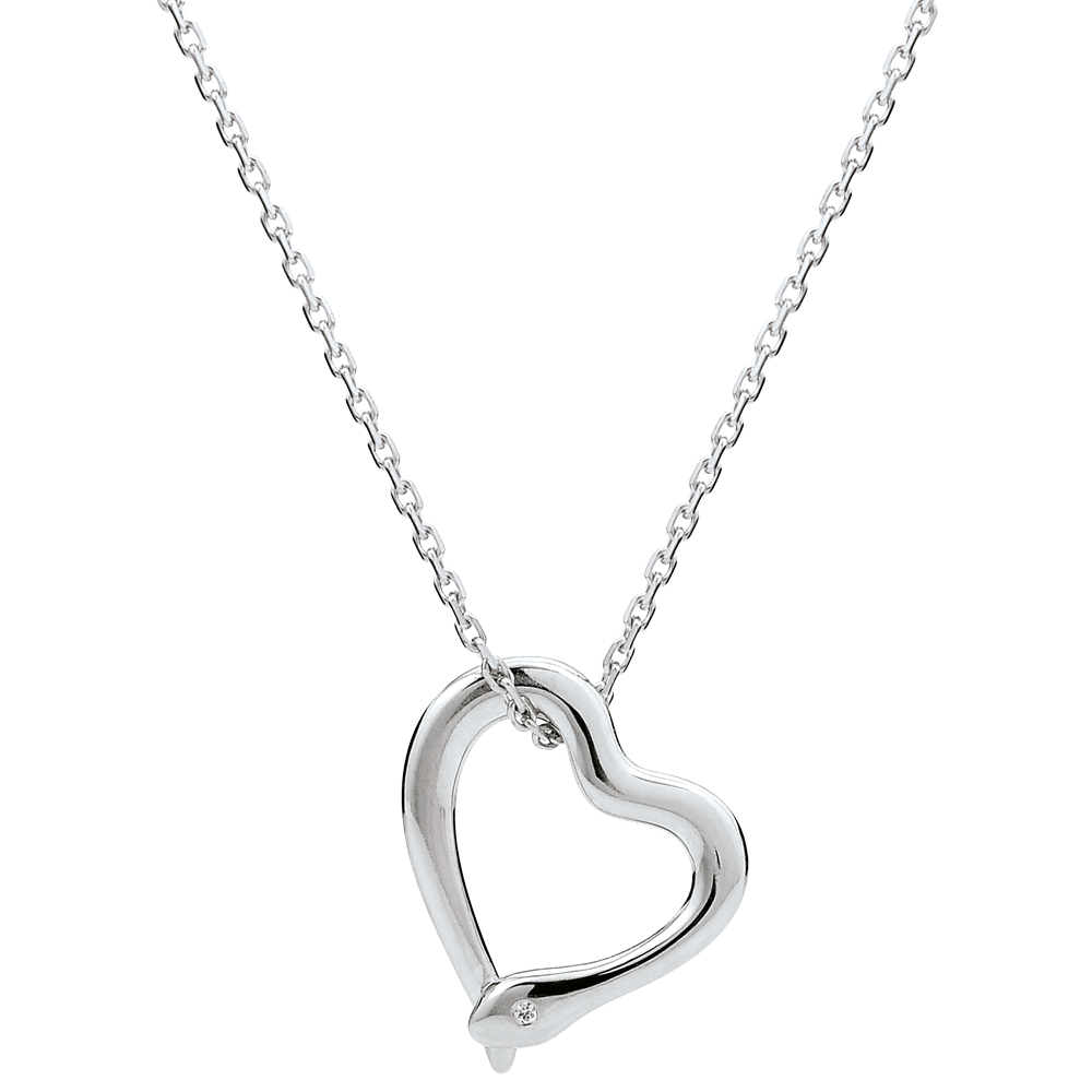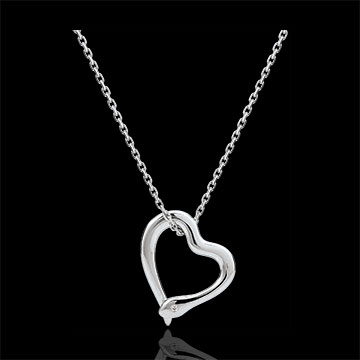 Un serpent paré d'or blanc s'enroule autour d'une chaine fine et féminine afin de former un coeur. Avec chaîne avec double position 42cm et 45cm en or 9 carats. 1 diamant : 0.01 carat - Or blanc (9 carats = 375/1000): 2.4 g. Plus dimensions