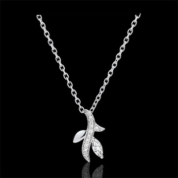 Une branche étincelante est figée dans l'intemporel. Sa feuille précieuse, la navette en diamant, est sublimée par l'or blanc serti de brillants qui leur sert d'écrin. Dimension navette: 4x2mm: 0.075 carat. Avec chaîne avec double position 42cm et 45cm en or 9 carats. 10 diamants : 0.12 carat - Or blanc (9 carats = 375/1000): 1.7 g. Plus dimensions