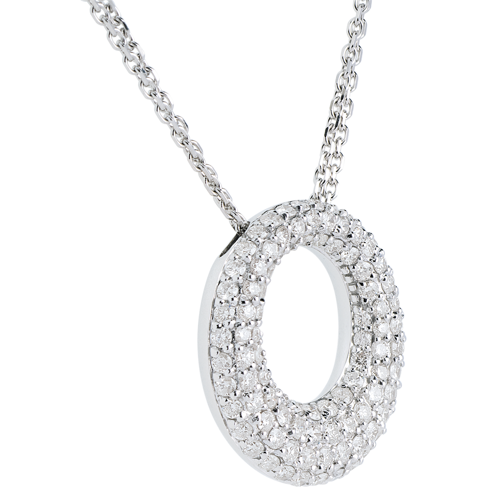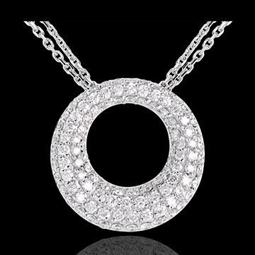 Un collier constellé d'éclat, dans le respect d'un équilibre circulaire idéal pour un bijou d'exception. Avec chaîne avec double position 42cm et 45cm en or 18 carats. 104 diamants : 1.55 carat - Or blanc (18 carats = 750/-): 6.5 g. Plus dimensions