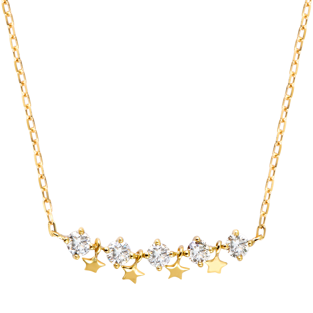 Cinq diamants scintillants soulignés de petites étoiles dorées suspendues avec légèreté.Un bijou poétique et lumineux, inspiré des cieux étoilés pour faire briller chaque instant. Avec chaîne avec double position 42cm et 45cm en or 9 carats. Or jaune (9 carats = 375/1000): 1.3 g. Diamant synthétique : 5 - Total: 0.25 caratPlus dimensions