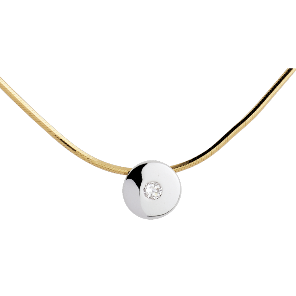 un pendentif en or blanc portant en son centre un diamant comme suspendu dans l'univers par un fil d'or. Chaîne en or jaune d'une longueur de 40cm. Avec chaîne avec double position 42cm et 45cm en or 18 carats. 1 diamant : 0.03 carat - Or blanc et or jaune (18 carats = 750/-): 3.6 g.Plus dimensions