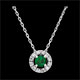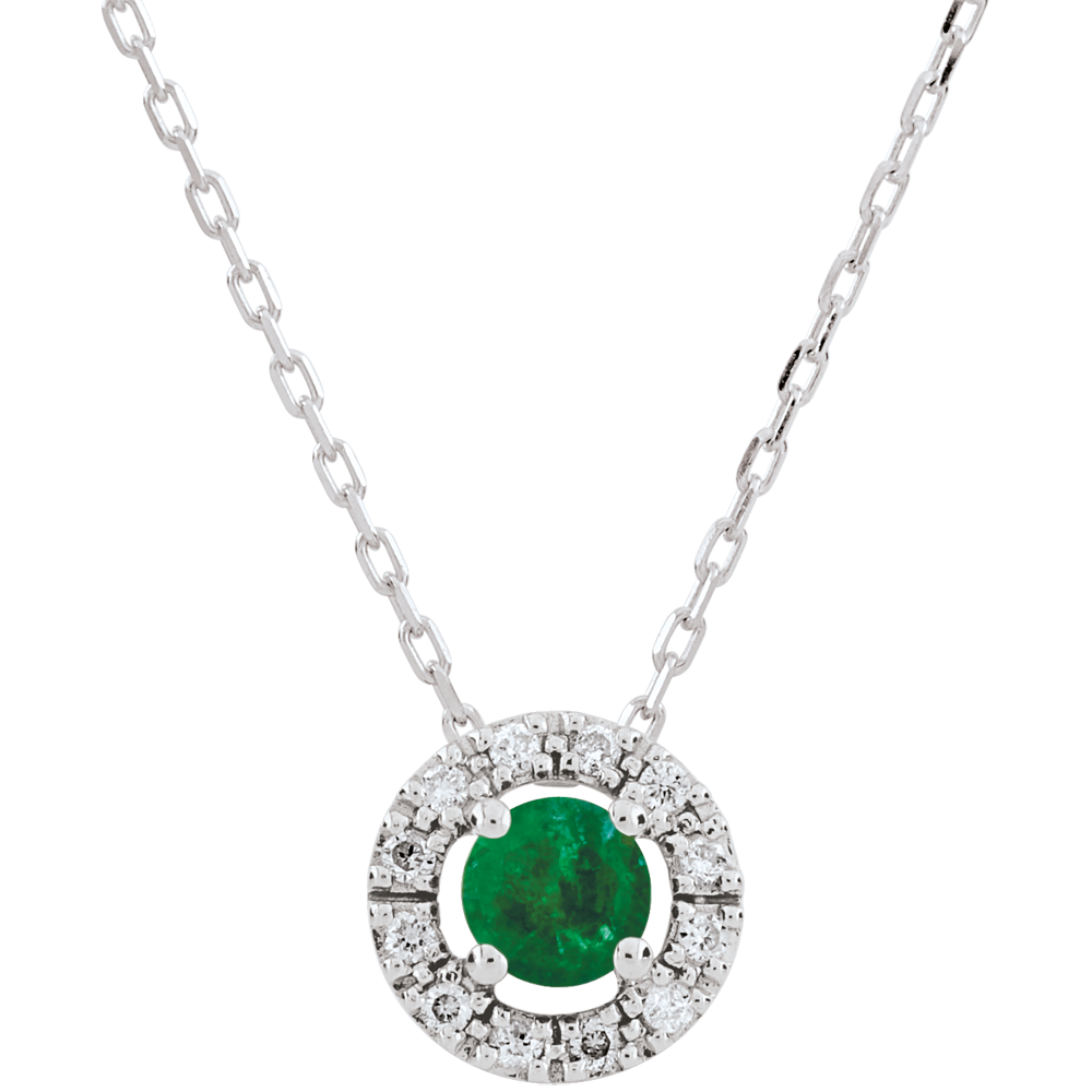 Un cercle d'or blanc serti de diamant protège comme un nid une émeraude. Avec chaîne avec double position 42cm et 45cm en or 18 carats. 12 diamants : 0.07 carat - Or blanc (18 carats = 750/-): 2.2 g. Émeraude : 1 - Total: 0.26 carat Plus dimensions