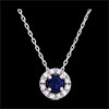 Un cercle d'or blanc serti de diamant protège comme un nid un saphirs. Avec chaîne avec double position 42cm et 45cm en or 9 carats. 12 diamants : 0.07 carat - Or blanc (9 carats = 375/1000): 1.7 g. Saphir bleu : 1 - Total: 0.36 carat Plus dimensions