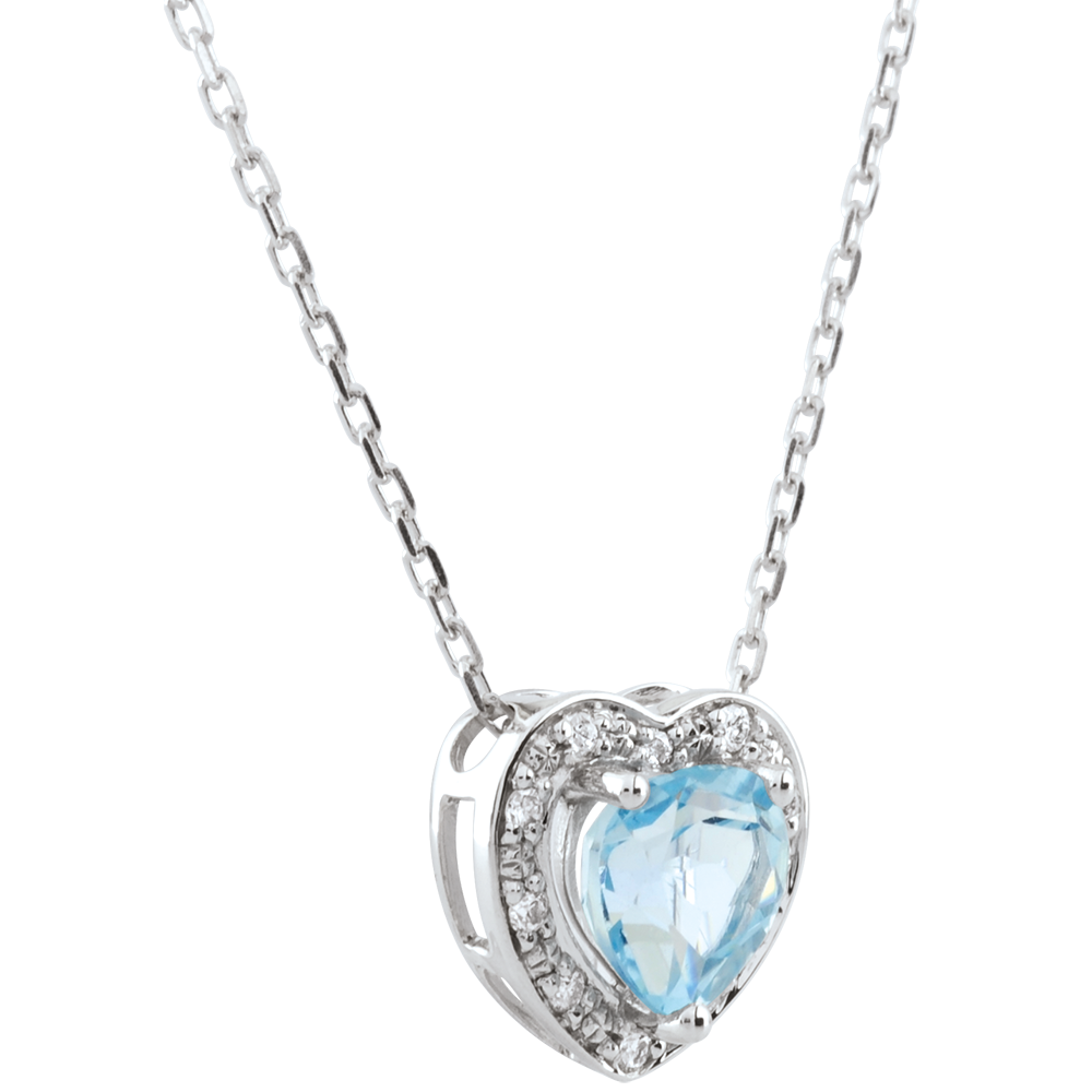 Un précieux coeur en or blanc et incrusté de diamants se fait l'écrin d'une somptueuse topaze bleue. Avec chaîne avec double position 42cm et 45cm en or 18 carats. 10 diamants : 0.06 carat - Or blanc (18 carats = 750/-): 2.1 g. Topaze bleue : 1 - Total: 0.97 carat Plus dimensions