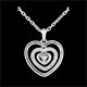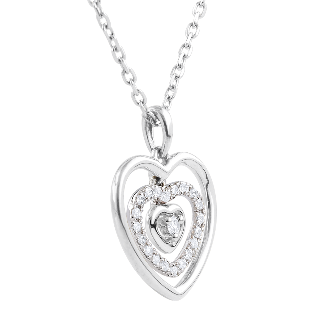 Une trilogie de coeurs en abyme, mobiles et aériens est composée de deux coeurs en or, un coeur en pavage de diamants et un diamant central à 3 griffes. Avec chaîne avec double position 42cm et 45cm en or 18 carats. 21 diamants : 0.1 carat - Or blanc (18 carats = 750/-): 2.8 g. Plus dimensions