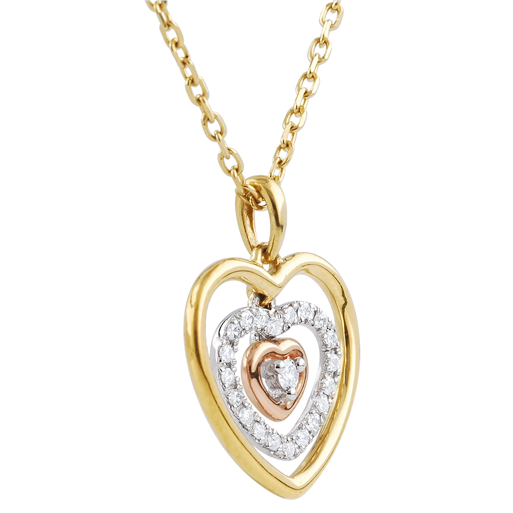 Une trilogie de coeurs en abyme, mobiles et aériens est composée d'un coeur en or jaune, un coeur en pavage de diamants et un diamant central à 3 griffes entouré d'un coeur en or rose. Avec chaîne avec double position 42cm et 45cm en or 18 carats. 21 diamants : 0.1 carat - Trois ors (18 carats = 750/-): 2.9 g. Plus dimensions