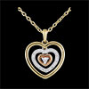 Une trilogie de coeurs en abyme, mobiles et aériens est composée d'un coeur en or jaune, un coeur en pavage de diamants et un diamant central à 3 griffes entouré d'un coeur en or rose. Avec chaîne avec double position 42cm et 45cm en or 9 carats. 21 diamants : 0.1 carat - Trois ors (9 carats = 375/1000): 2.1 g. Plus dimensions