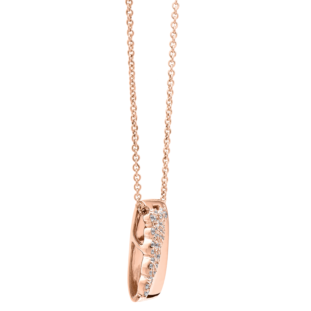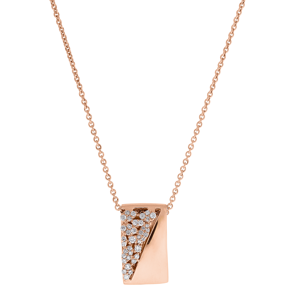 Pavage de 38 diamants blancs de qualité HSI pour un éclat discret et raffiné Or rose 18 carats poli, symbole de douceur et d'élégance durable Chaîne ajustable 42-45 cm pour un confort personnalisé Design géométrique contemporain inspiré de figures féminines marquantes FAQ