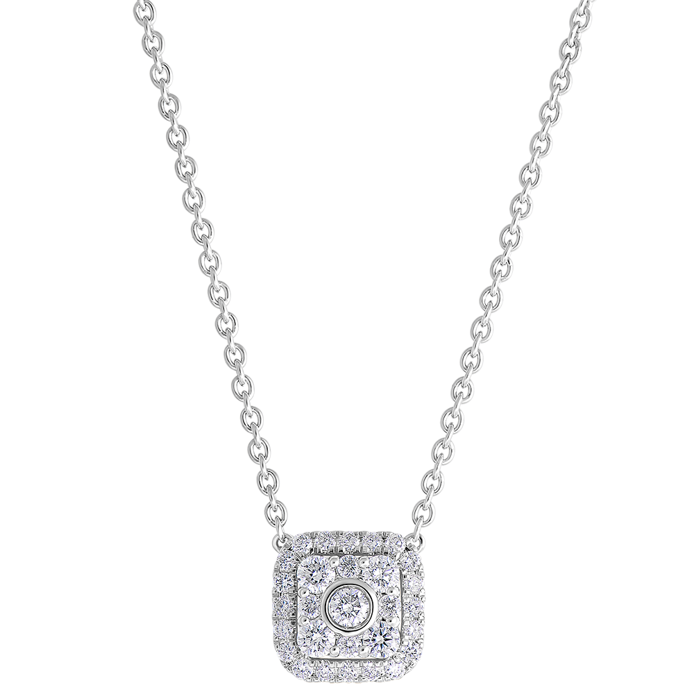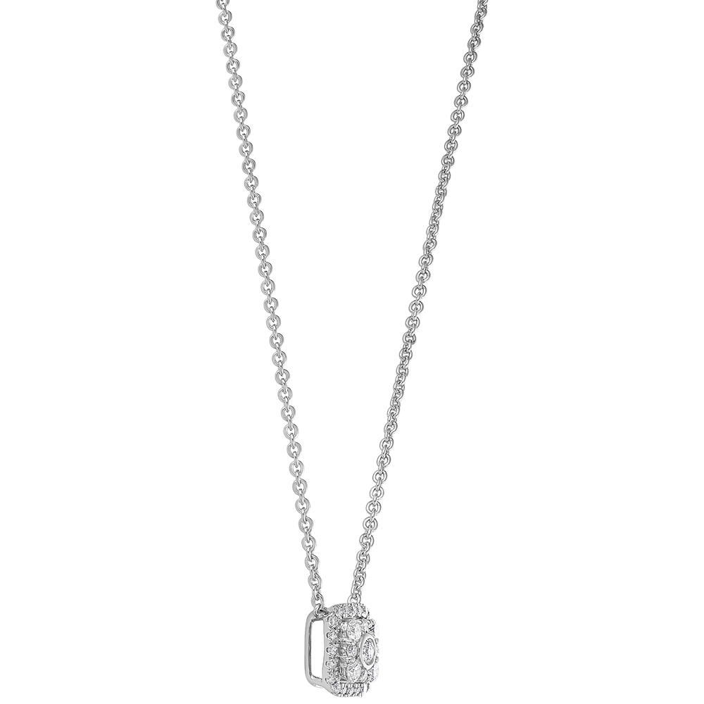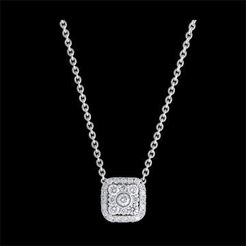 Tel un coussin capitonné de diamants, ce collier en or blanc pare toutes vos tenues. Avec chaîne avec double position 42cm et 45cm. Avec chaîne avec double position 42cm et 45cm en or 9 carats. 29 diamants : 0.26 carat - Or blanc (9 carats = 375/1000): 2.4 g. Cluster de diamants naturels : 29 - Plus dimensions
