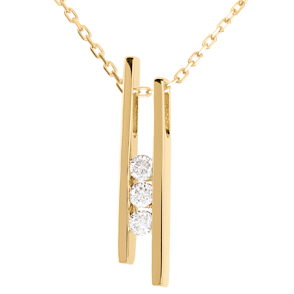 Toute la mesure du diapason or jaune 3 diamants, pour un équilibre et une harmonie parfaite. Avec chaîne avec double position 42cm et 45cm en or 18 carats. 3 diamants : 0.1 carat - Or jaune (18 carats = 750/-): 2.4 g. Plus dimensions