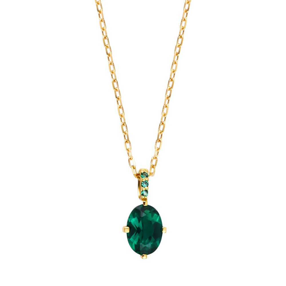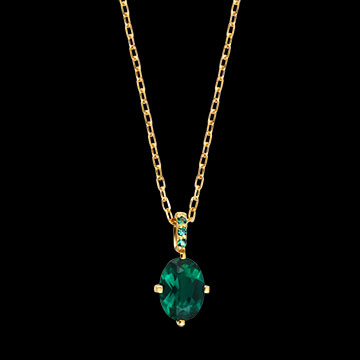 Une émeraude ovale de 1 carat mise en lumière par trois petites émeraudes sur la bélière.Un bijou éclatant aux reflets verts intenses, symbole de renouveau et d’élégance naturelle. Avec chaîne avec double position 42cm et 45cm en or 9 carats. Or jaune (9 carats = 375/1000): 1.5 g. Émeraude synthétique : 4 - Total: 1.03 carat Plus dimensions