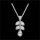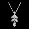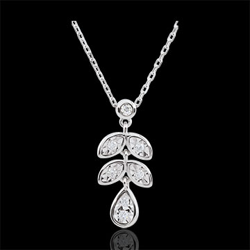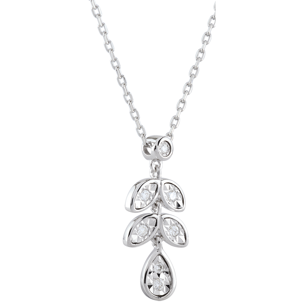 Un délicat motif de feuillage diamanté étincelle à chacun de vos mouvements à votre cou. Avec chaîne avec double position 42cm et 45cm en or 9 carats. 7 diamants : 0.09 carat - Or blanc (9 carats = 375/1000): 2.2 g. Plus dimensions