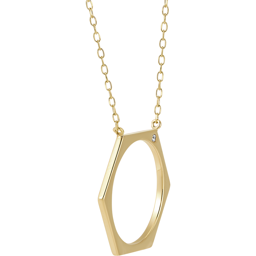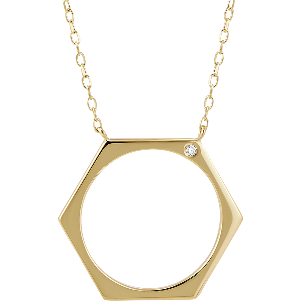 Ce collier minimaliste est inspiré de la forme hexagonale des alvéoles de la ruche. Son motif en or jaune de forme hexagonale est orné d'un unique diamant sertie sur son bord.Ce design épuré et moderne en fait une pièce de joaillerie intemporelle. Avec chaîne avec double position 42cm et 45cm en or 9 carats. Or jaune (9 carats = 375/1000): 1.2 g. Diamant synthétique : 1 - Total: 0.005 carat Plus dimensions