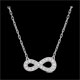 Un signe infini en or blanc serti de diamants est monté en collier. Il est le symbole d'éternité absolu. Avec chaîne avec double position 42cm et 45cm en or 9 carats. 21 diamants : 0.11 carat - Or blanc (9 carats = 375/1000): 1.7 g. Plus dimensions