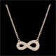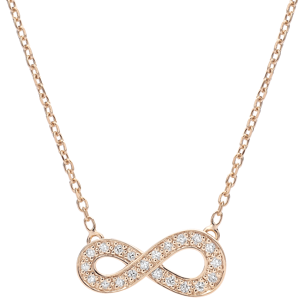 Un signe infini en or rose serti de diamants est monté en collier. Il est le symbole d'éternité absolu. Avec chaîne avec double position 42cm et 45cm en or 18 carats. 21 diamants : 0.11 carat - Or rose (18 carats = 750/-): 2.3 g. Plus dimensions
