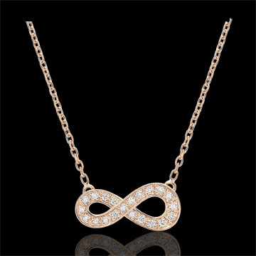 Un signe infini en or rose serti de diamants est monté en collier. Il est le symbole d'éternité absolu. Avec chaîne avec double position 42cm et 45cm en or 9 carats. 21 diamants : 0.11 carat - Or rose (9 carats = 375/1000): 1.7 g. Plus dimensions