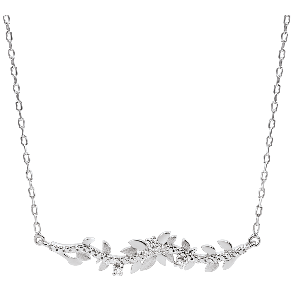 Une alternance de feuilles d'or blanc brillantes et de feuilles d'or brossées à la main pour un collier romantique serti de 7 diamants. Avec chaîne avec double position 42cm et 45cm en or 18 carats. 7 diamants : 0.05 carat - Or blanc (18 carats = 750/-): 2.6 g. Plus dimensions