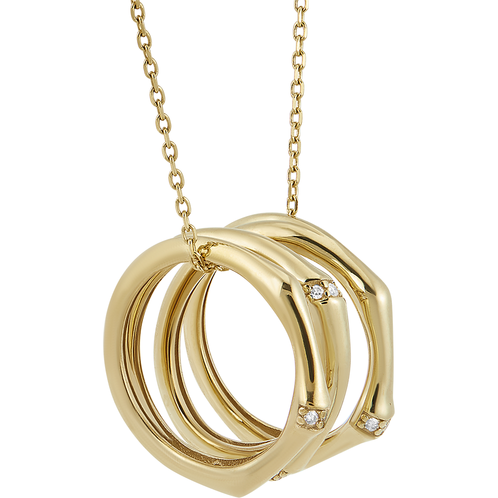 Une branche de bambou souple et solide enroulée sur 3 rangs se métamorphose en un collier éternel. Les nœuds du bambou sont incrustés de diamants dans l'or. Avec chaîne avec double position 42cm et 45cm en or 9 carats. 12 diamants : 0.04 carat - Or jaune (9 carats = 375/1000): 3.5 g. Plus dimensions