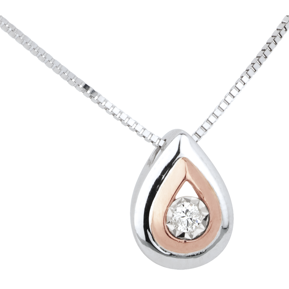 Une délicate larme en or blanc et or rose dont l'éclat est un diamant scintillant en son centre. Avec chaîne avec double position 42cm et 45cm en or 18 carats. 1 diamant : 0.03 carat - Or blanc et or rose (18 carats = 750/-): 2.1 g. Plus dimensions