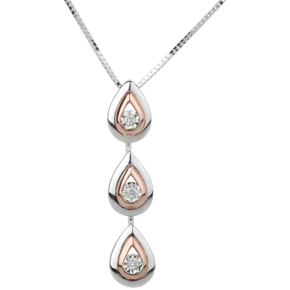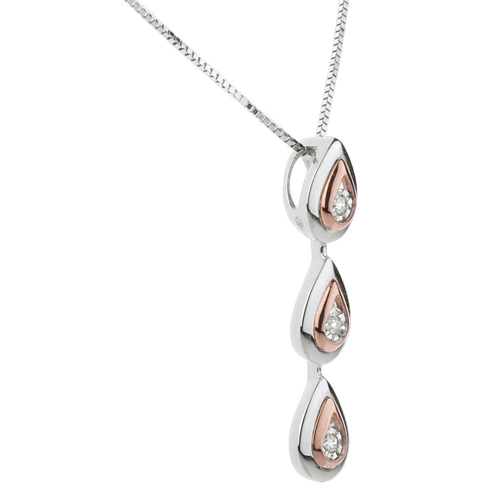 Trois délicates larmes en or blanc et or rose dont l'éclat est un diamant scintillant en leur centre. Longueur 25mm et largeur 5.5mm. Avec chaîne avec double position 42cm et 45cm en or 18 carats. 3 diamants : 0.03 carat - Or blanc et or rose (18 carats = 750/-): 2.8 g. Plus dimensions