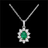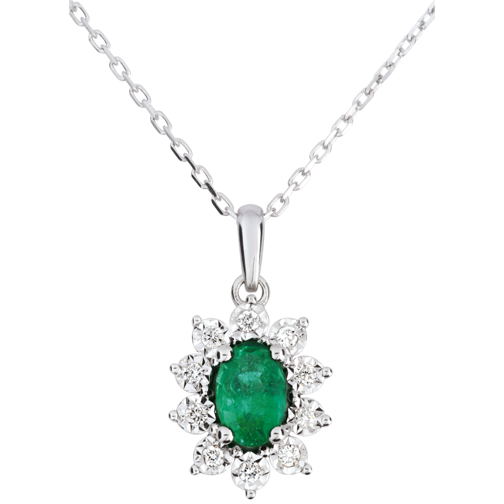Une émeraude ovale est le centre d'une marguerite d'or blanc aux pétales incrustés d'un diamant. Dimensions émeraude: longueur: 6mm - largeur: 4mm - profondeur: 3mm. Avec chaîne avec double position 42cm et 45cm en or 18 carats. 10 diamants : 0.08 carat - Or blanc (18 carats = 750/-): 2.9 g. Émeraude : 1 - Total: 0.44 carat Plus dimensions