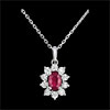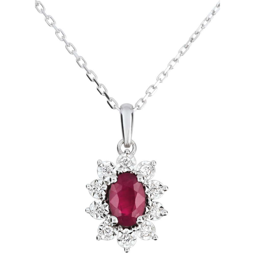 Un rubis ovale est le centre d'une marguerite d'or blanc aux pétales incrustés d'un diamant. Dimensions rubis: longueur: 6mm - largeur: 4mm - épaisseur: 3mm. Avec chaîne avec double position 42cm et 45cm en or 9 carats. 10 diamants : 0.08 carat - Or blanc (9 carats = 375/1000): 2.2 g. Rubis : 1 - Total: 0.53 carat Plus dimensions