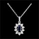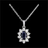 Un saphir ovale de synthèse (0.56 carats) est le centre d'une marguerite d'or blanc aux pétales incrustés de diamants de synthèse (0.08 carats). Dimensions saphir: longueur: 6mm - largeur: 4mm - épaisseur: 3mm. Avec chaîne avec double position 42cm et 45cm en or 9 carats. Or blanc (9 carats = 375/1000): 2.2 g. Saphir synthétique : 1 - Diamant synthétique : 10 - Total: 0.64 carat Plus dimensions