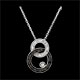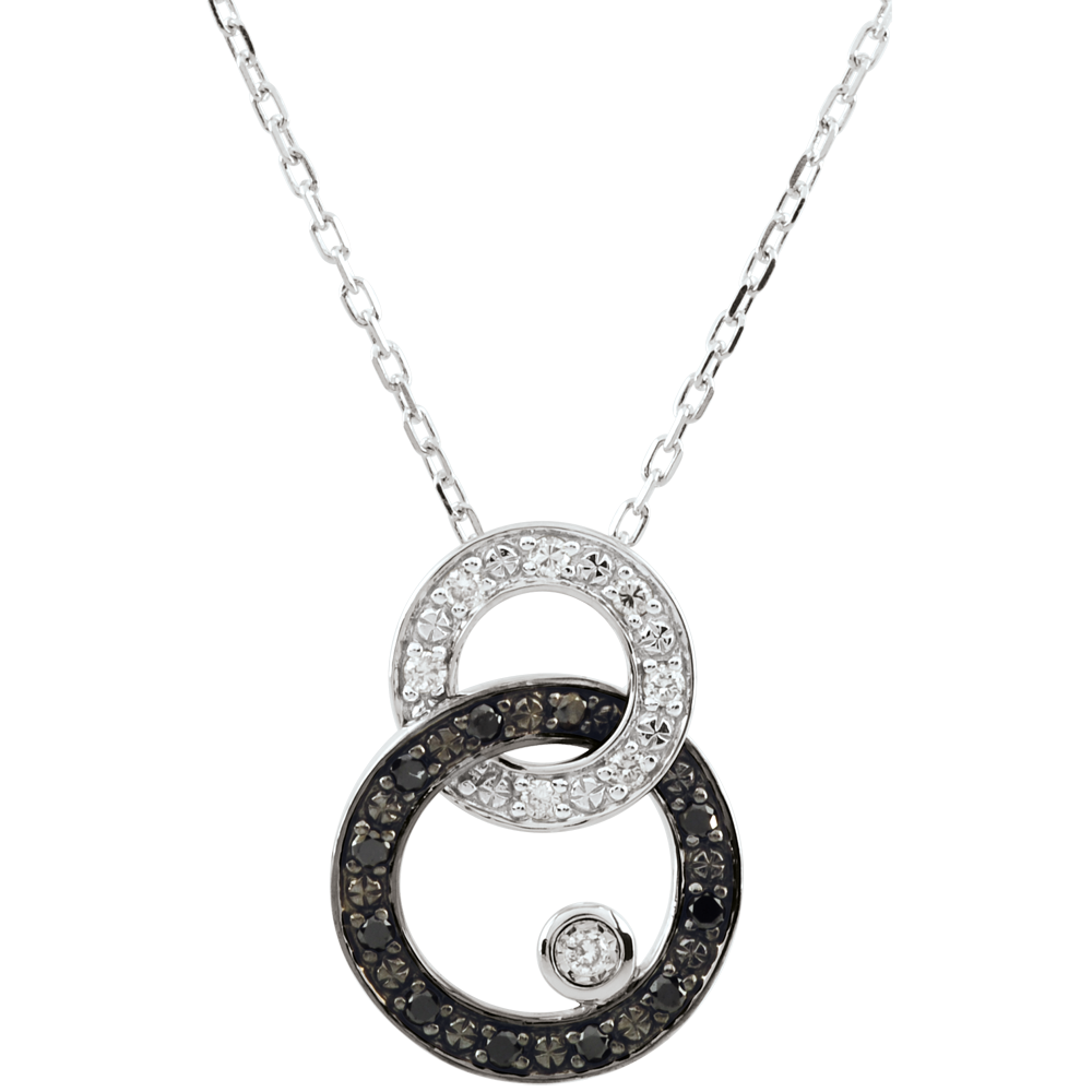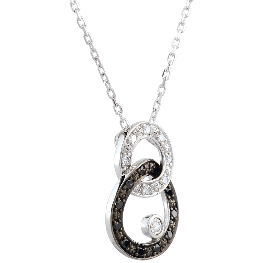 Tels des rubans, les cercles d'or sont enchevêtrés tout en souplesse. Le cercle en or blanc et diamants noirs porte un diamant solitaire dans une pastille d'or. Avec chaîne avec double position 42cm et 45cm en or 18 carats. 19 diamants : 0.13 carat - Or blanc (18 carats = 750/-): 2.9 g. Plus dimensions